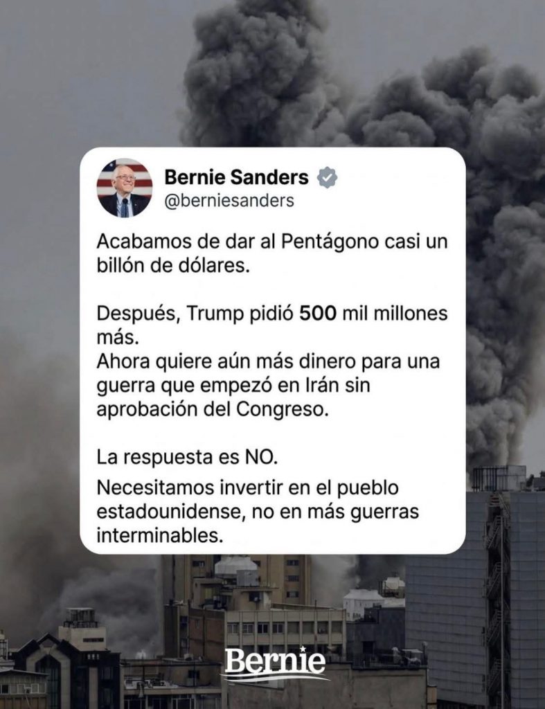 En un posicionamiento difundido en redes sociales, Sanders señaló que el Congreso ya aprobó recientemente casi un billón de dólares para el presupuesto del Pentágono, una cifra que consolida a Estados Unidos como el país con el mayor gasto militar del mundo. Sin embargo, el senador criticó que posteriormente el presidente Donald Trump habría solicitado 500 mil millones de dólares adicionales, lo que —según afirmó— podría estar relacionado con preparativos para una escalada militar en Medio Oriente.