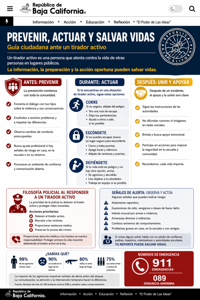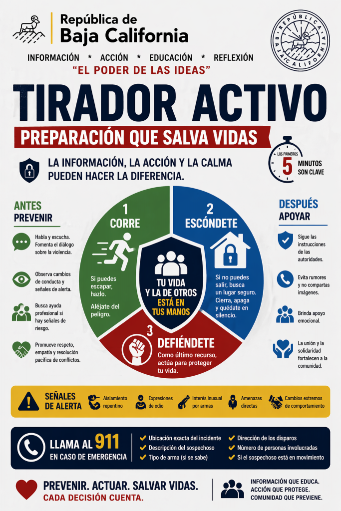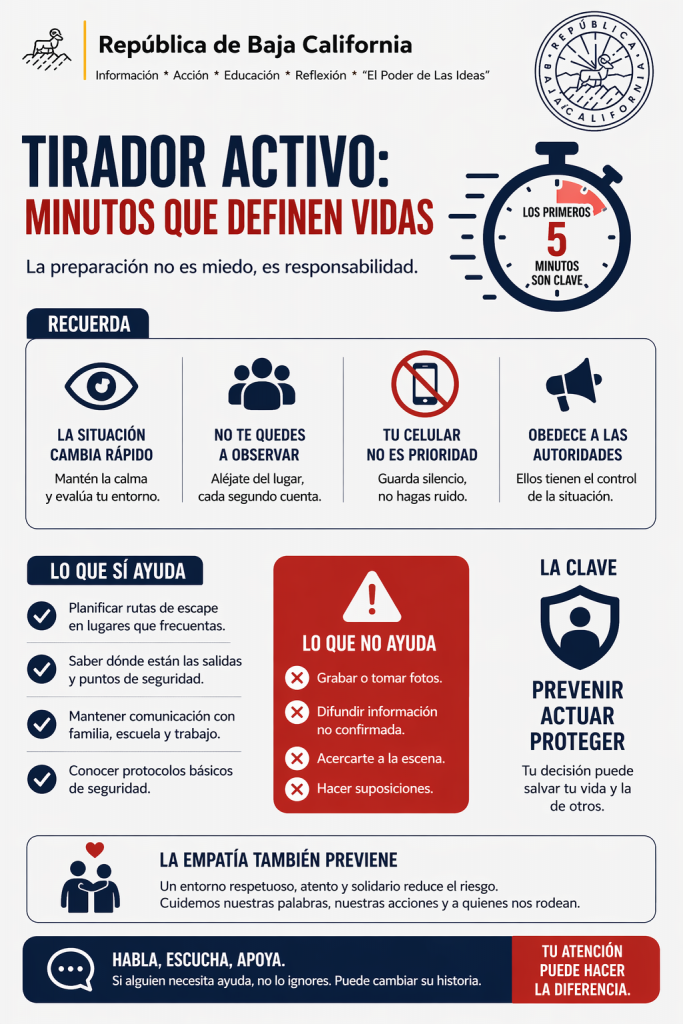 En Baja California, como en muchas regiones fronterizas, la dinámica social y la exposición a distintos contextos de violencia hacen aún más relevante este tipo de información. No se trata de vivir con miedo, sino de vivir con criterio. Saber qué hacer reduce el pánico y aumenta las probabilidades de tomar decisiones correctas.