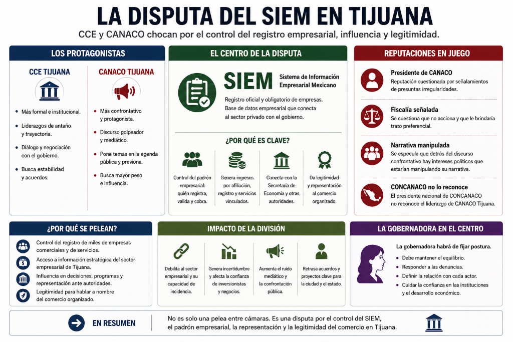 La tensión entre la CANACO Tijuana y el CCE Tijuana ha escalado más allá de un simple diferendo público. Lo que está en juego es el control del Sistema de Información Empresarial Mexicano, una herramienta clave para la organización, representación y conexión del sector empresarial con el gobierno.